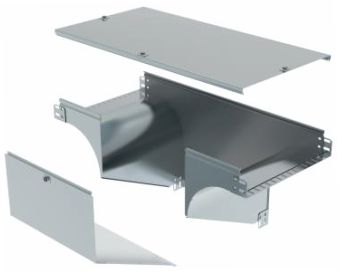 derivazione verticale a t in discesa con variazione di piano, completa di coperchio. altezza: 75 mm. larghezza: 400 mm. finitura z: acciaio zincato sendzimir.